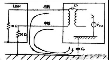 分析:上圖是樣品不帶地線時(shí),傳導(dǎo)測(cè)試的簡化原理,EUT產(chǎn)生的工模騷擾,經(jīng)過50歐姆阻抗,然后通過實(shí)驗(yàn)室接地銅板和EUT共模騷擾地之間形成的耦合電容CP,形成騷擾回路,接收機(jī)測(cè)試到的信號(hào)就是50歐姆阻抗上的壓降。那么,接入地線以后,以上的測(cè)試過程有哪些變化呢?請(qǐng)看下圖: